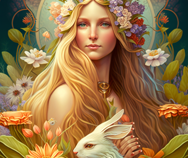 - Entourée de Fleurs et de Verdure : Dans de nombreuses représentations, Ostara est entourée de fleurs printanières telles que les jonquilles, les tulipes et les primevères, ainsi que de feuillage verdoyant, soulignant son rôle dans le renouveau de la nature.