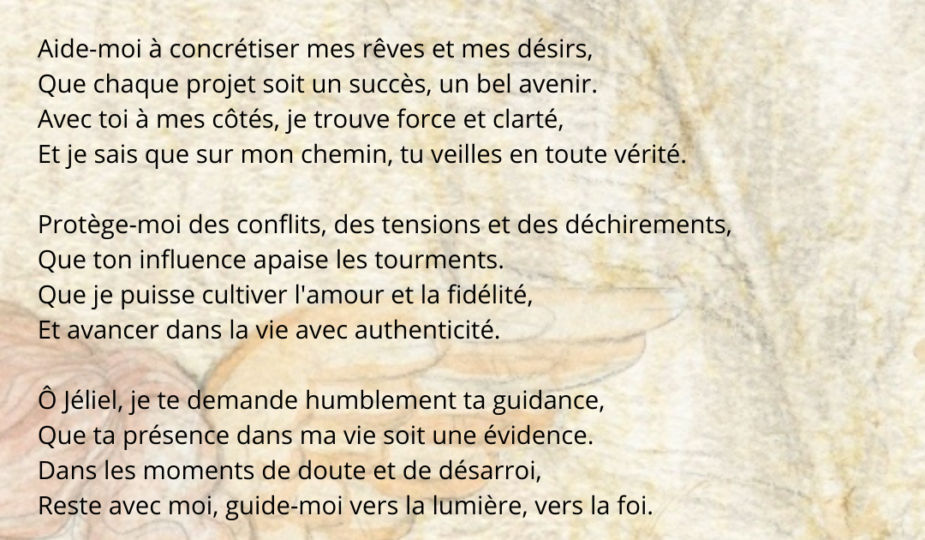 Demandez l’aide de Jéliel lorsque vous vous sentez déçu par les circonstances ou confronté à un conflit soudain, pour retrouver confiance en vous-même.
