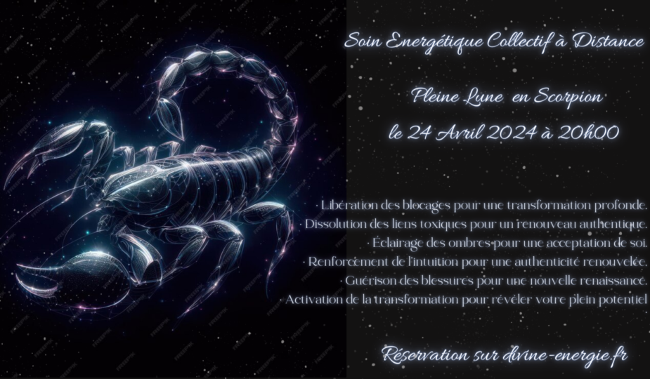 La Pleine Lune en Scorpion approche à grands pas, et je suis ravie de vous convier à participer à un soin énergétique collectif à distance, axé sur la libération des blocages, la dissolution des liens toxiques et l’éclairage des ombres pendant cette phase lunaire idéale pour favoriser la transformation profonde, le renouveau authentique et l’acceptation de soi.