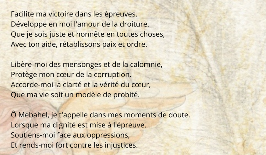 Appelez Mebahel lorsque vous avez besoin de soutien pour obtenir justice, vérité et liberté. Demandez son aide pour surmonter les oppressions et les injustices, et pour recevoir la protection contre les mensonges et la calomnie.