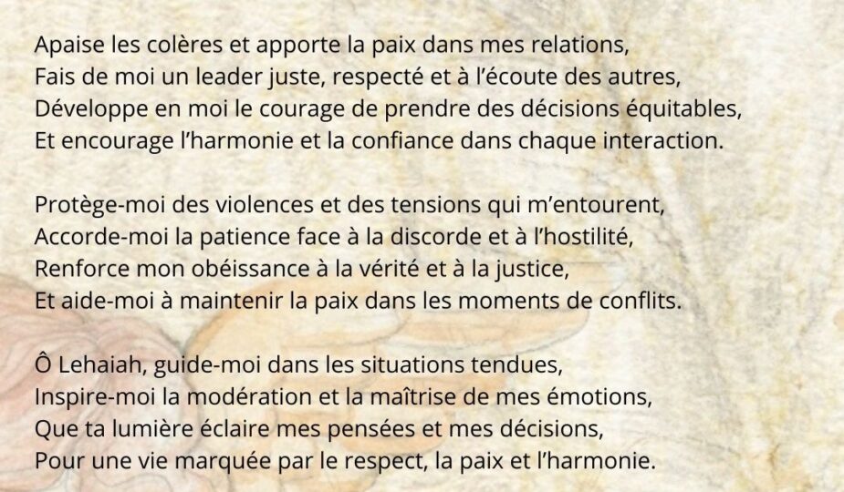 Invoquez Lehaiah lorsque vous ressentez de la colère ou un manque de contrôle émotionnel. Demandez-lui d’apporter la paix dans votre cœur, d’inspirer des pensées de compréhension et de modération, et de dissiper les énergies négatives autour de vous.