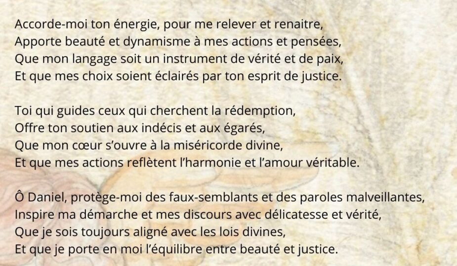 Invoquez Daniel pour obtenir le soutien nécessaire dans vos entreprises, pour exprimer votre vérité avec clarté et harmonie, et pour bénéficier de la miséricorde divine dans les moments de difficulté.