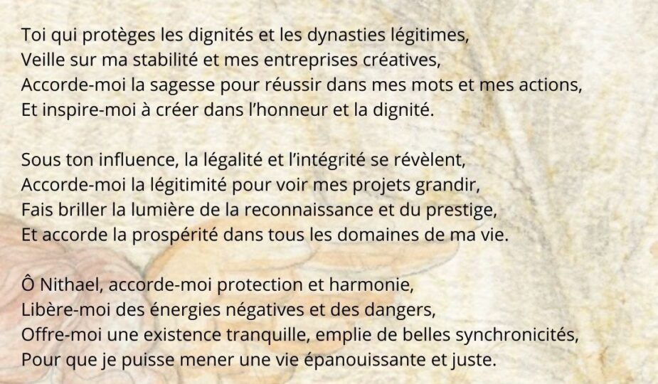 Invoquez Nithael pour demander sa protection contre les injustices et les dangers, notamment dans les domaines financiers et professionnels. Demandez-lui des opportunités pour maintenir une vie stable, protégée et épanouissante, et pour apporter l’harmonie et la paix dans vos créations et vos relations.