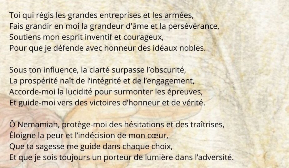 Invoquez Nemamiah lorsque vous avez besoin de discernement, de force de décision et de prospérité, ou pour éloigner la peur et clarifier les situations difficiles.