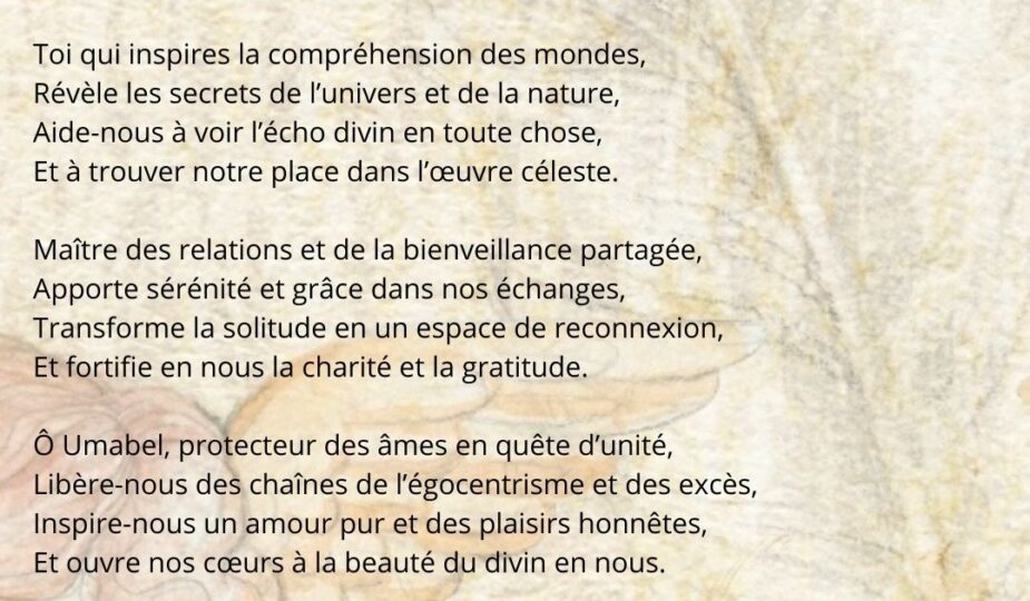 Invoquez Umabel pour renforcer vos liens d’amitié, retrouver l’harmonie dans vos relations, et développer votre compréhension des liens entre la nature et l’univers. Priez-le pour surmonter la solitude et vous reconnecter à votre mission divine.