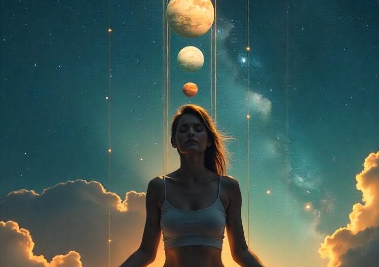 Imaginez-vous au centre de l’Univers, entourée des sept planètes alignées. Chaque astre brille d’une lumière propre, vibrant à une fréquence unique. Visualisez un rayon de lumière dorée descendre du cosmos, traversant chaque planète avant d’entrer en vous.