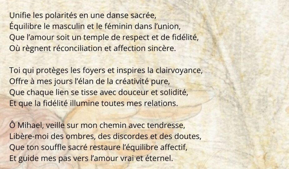 Invoquez Mihael pour solliciter l’amour sincère, l’union harmonieuse et la protection des liens familiaux. Demandez-lui guidance et bénédictions pour restaurer ou maintenir l’équilibre dans votre vie sentimentale et personnelle.